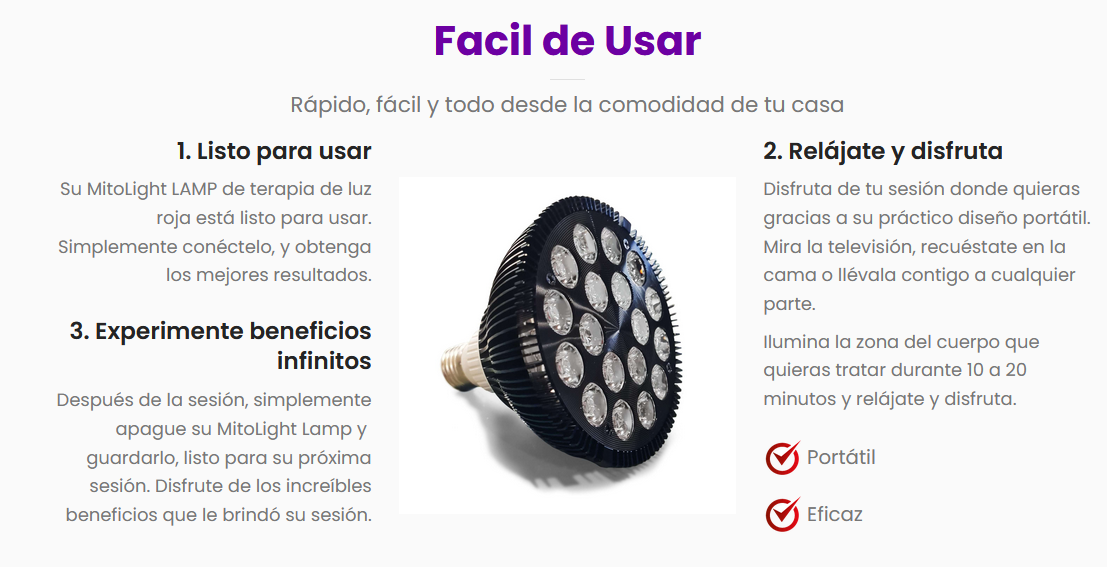 El dispositivo MitoLight LAMP es un dispositivo portátil de terapia de luz roja+NIR de alta irradiancia emitiendo longitud de luz 660nm (rojo) y 850nm (Infrarrojo cercano). Ideal para la recuperación muscular localizada, la mejora del aspecto de la piel y el aumento de la producción de energía. Se puede implementar fácilmente en su rutina diaria de bienestar, con tan solo 10 minutos por día.